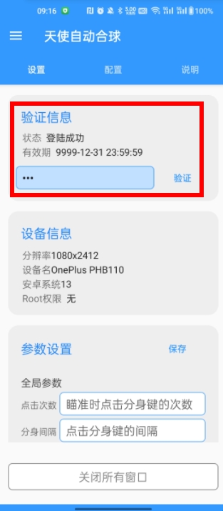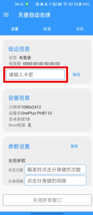 想要使用天使自动合球的全部功能,需要输入卡密,不过该版本已经解锁了卡密限制。