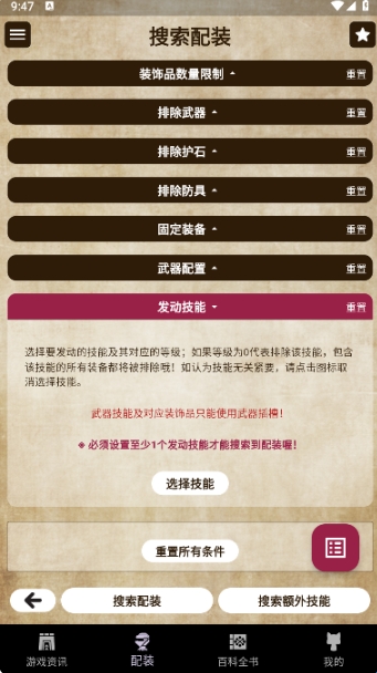 2、可以设定包含、排除技能、设定装饰品数量限制、固定、排除装备。