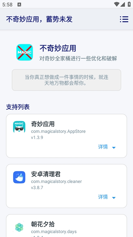不奇妙应用是一款专为奇妙应用软件打造的修改工具。该版本去除了广告、付费和会员的功能,部分资源全部支持用户自定义下载,如朝花夕拾、奇妙应用等等。软件适配大部分机型,兼容性极强,并且软件还在实时更新,保证让每一位用户都可以使用该软件!感兴趣的小伙伴快来下载体验一下吧!
