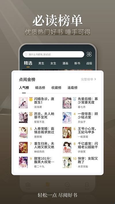 点阅小说大全是一款专为小说爱好者打造的手机追书神器。软件收录了海量题材的精选小说,并将它们分为了多种必读榜单,包括人气榜、精选榜、收藏榜、连载榜等,从而轻松挑选喜欢的小说。软件界面简约,有亮度、主题、主题色等多项设置可以调节,欢迎感兴趣的朋友们下载体验。
