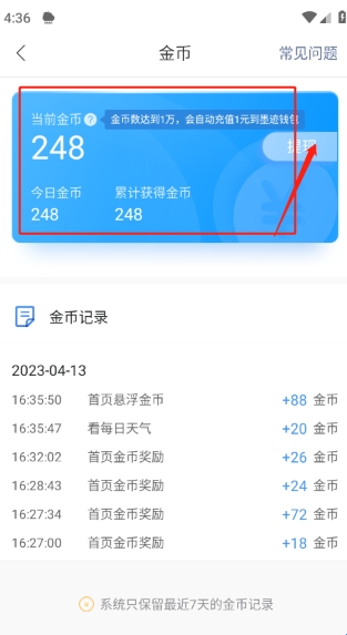 最后你可以看到钱包里的金币数量,当金币数量达到1万时会自动充值到墨迹钱包。