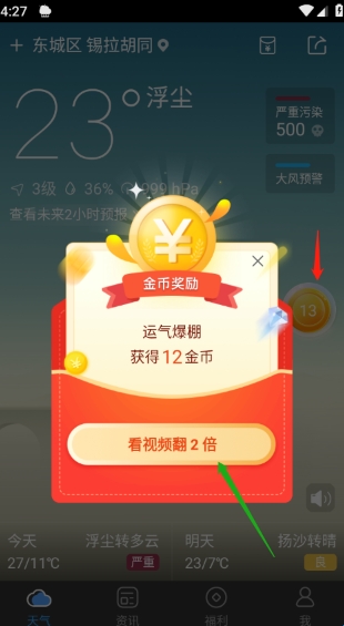 登录成功之后回到天气页面,点击金币即可获得相对应的金币数量,如果想获得更多金币的话,可点击看视频翻两倍,看完视频即可。