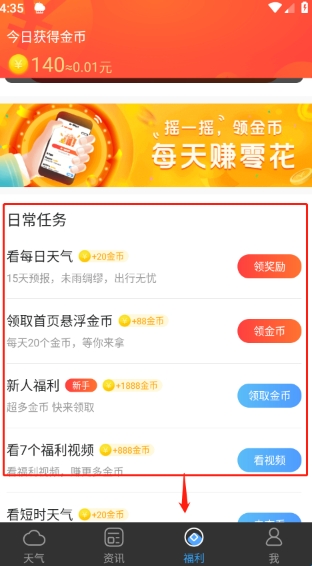 随后还可以在福利界面看到日常任务,完成日常任务即可获得相对应的金币。