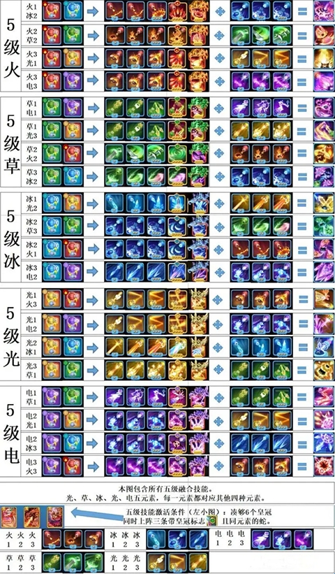 激活五级融合技能的难度则更高。不仅需要同时上阵三条戴皇冠标志且同一元素的蛇,而且三条蛇总共要拥有6个皇冠。在满足以上条件之后,再依照对应的元素搭配,即可激活对应的五级融合技能。
