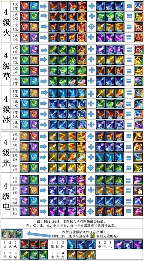 合成三级融合技能需要两个三级技能,且不分先后顺序。玩家只需按照如下所示的图片进行元素搭配,即可自动激活对应的三级融合技能。三级融合技能的出现,不同的三级融合技能具有不同的效果,玩家可以根据自己的游戏风格和战斗需求,选择合适的技能进行搭配。