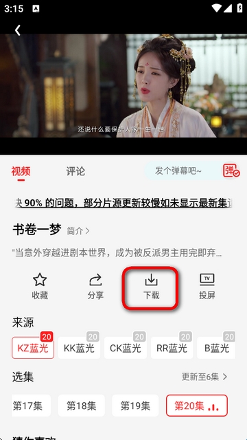 1、打开要下载的剧集播放页面,选择下载按钮。