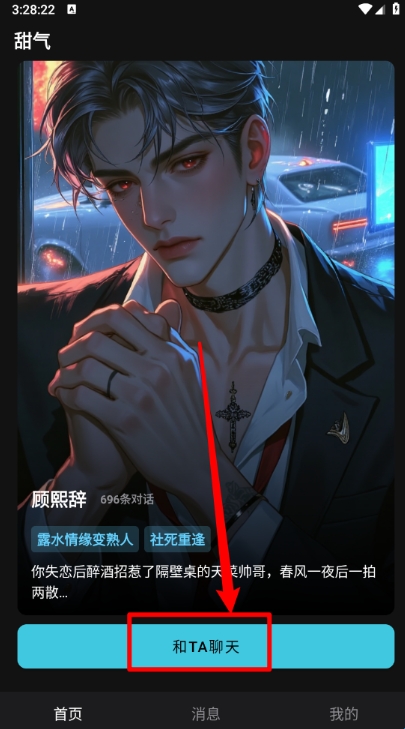 进入首页滑动就可以选择喜欢的角色,点击"和TA聊天"进入。