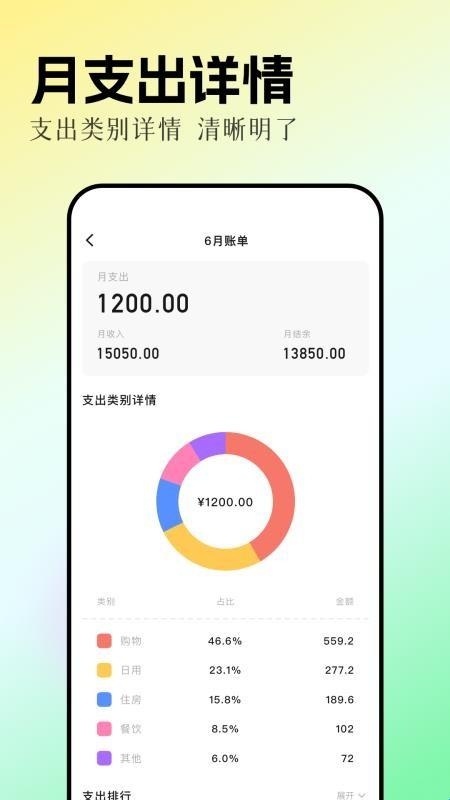 所提供的支出排行十分的清晰,用户可以直观查询,清晰查询自己的支出排行。