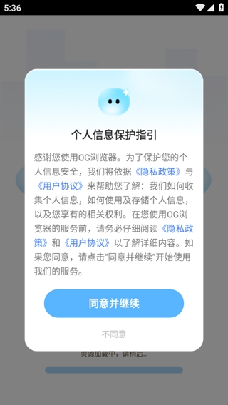 1、阅读隐私政策和用户协议之后点击同意并继续;