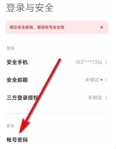 在安全中心设置中选择【帐号密码】功能,点击进入。