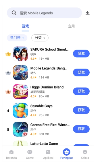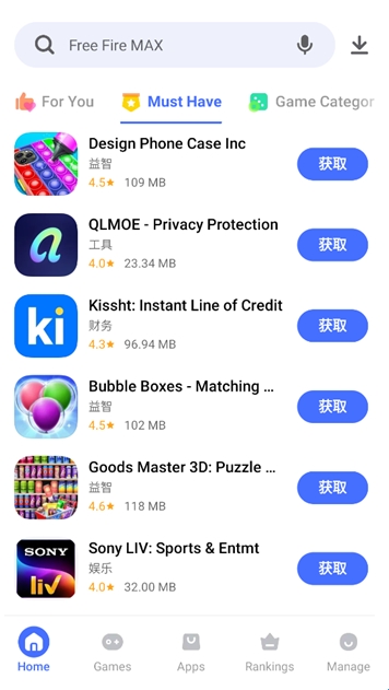 然后任意选择一款手游并点击【获取】即可进行下载。