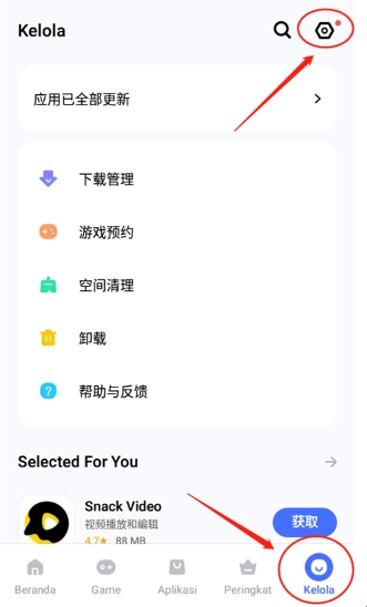 首先点击【Kelola】界面内右上角的【设置】选项。