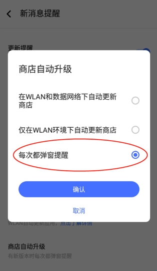 然后选择【每次都弹窗提醒】即可自动提醒更新。
