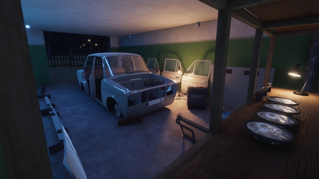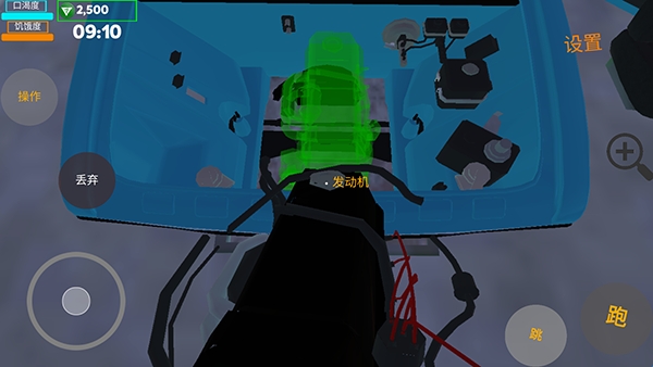 3、找到车库后,车辆是没有组装的状态,此时我们将零件一个个的安装进汽车里(对准物品点击左上角操作,将物品放置到汽车指定位置,点击操作安装),将所有物品安装好之后进入汽车。