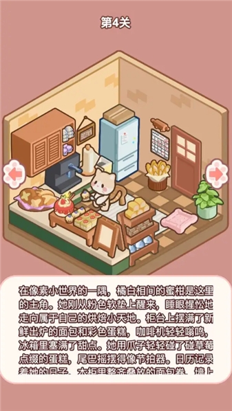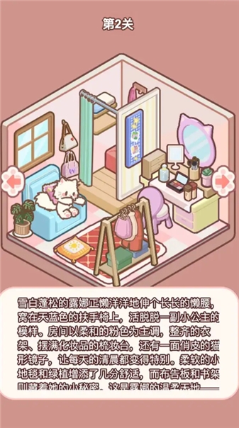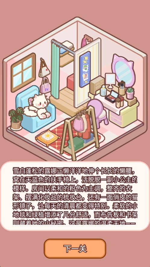 过关奖励与体验:过关后会展示完整的喵居布置效果,同时弹出 “通关成功”提示,玩家可截图保存自己的装饰成果,解锁下一个新风格房间