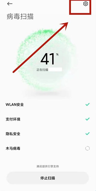 进入安全中心界面,点击右上角【设置】图标,打开设置界面;