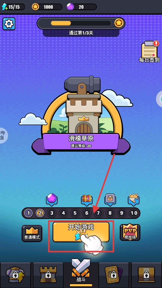 1、点击【开始游戏】进入【滑稽草原】关卡,建议等级【20】,可开启冒险战斗。