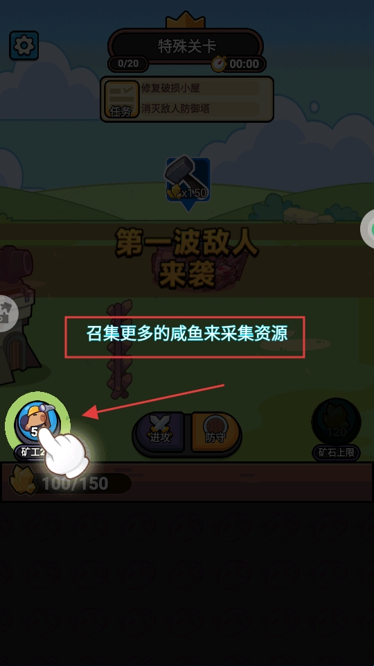 2、点击【矿工】按钮召集更多咸鱼,采集资源推进【修复破损小屋】等任务。