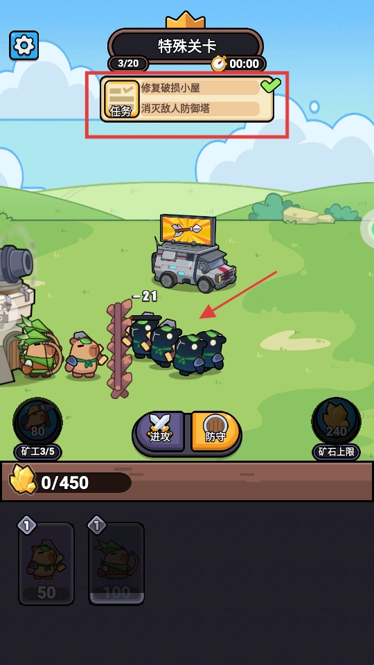 3、完成修复任务后,指挥部队抵御敌人进攻,积累进度朝着【消灭敌人防御塔】推进。