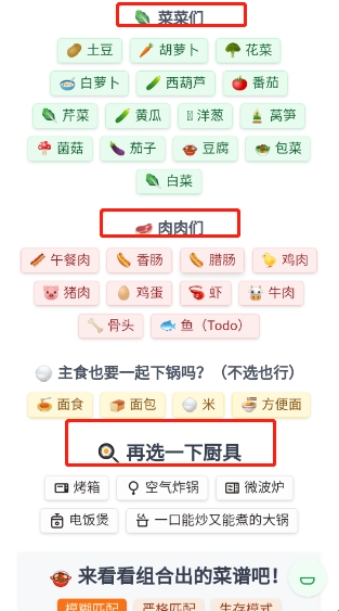 下载进入隔离食用手册App,首先需要根据自己拥有的食材和厨具选择相应的关键字;