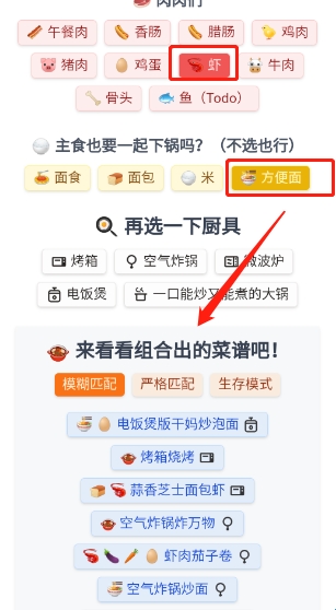 如下图所示,选择到“虾”和“方便面”两个关键字后,即可快速生成菜谱;