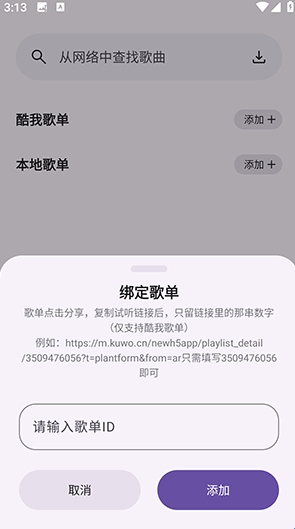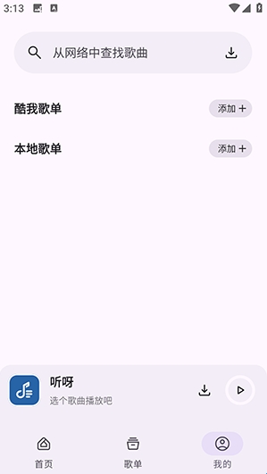 点击我的页面,这里提供了本地歌单以及酷我歌单。
