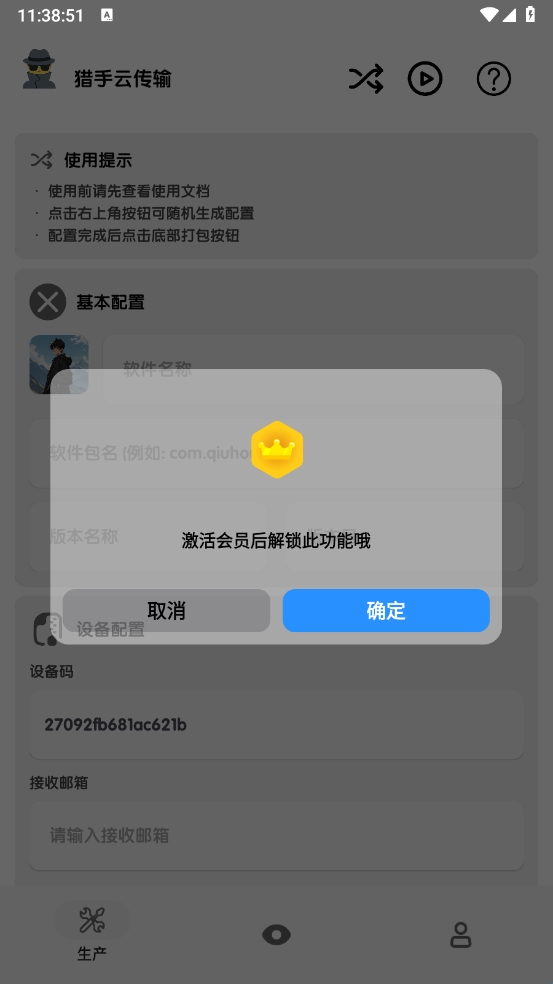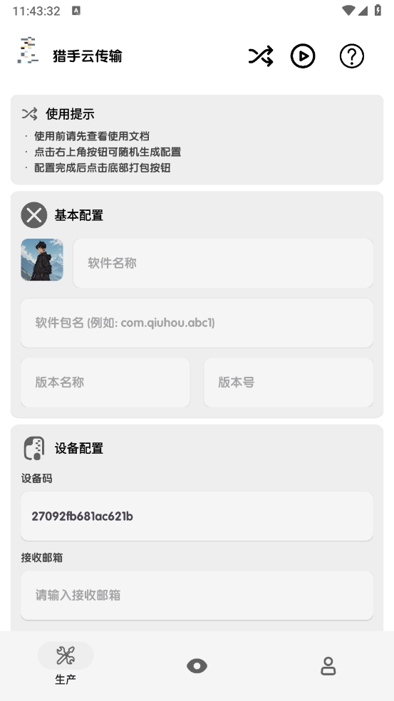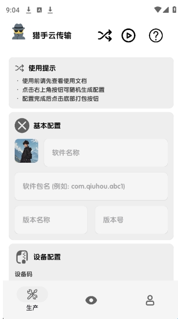 打开猎手云传输APP,在基础配置部分填写软件名称、软件包名、版本名称和版本号;
