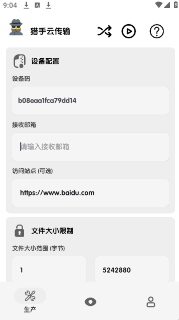 在设备配置部分,确认设备码,输入接收邮箱,设置访问站点(可选),并设定文件大小限制范围。