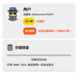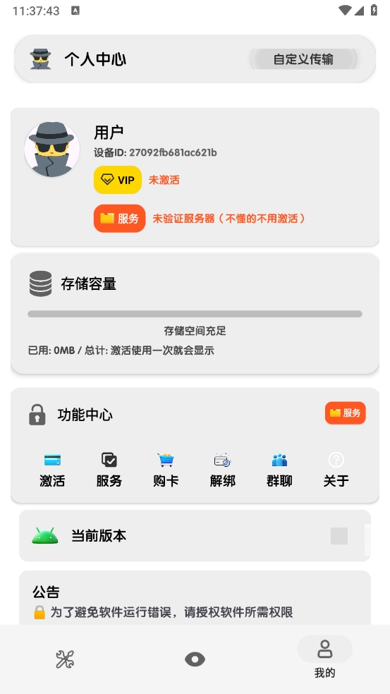 进入个人中心,可查看用户及设备码信息,了解VIP(未激活)和服务(未验证服务器)状态,查看存储容量情况,也可在功能中心进行激活、服务、购卡、解绑、群聊、关于等操作,还能使用“自定义传输”功能。