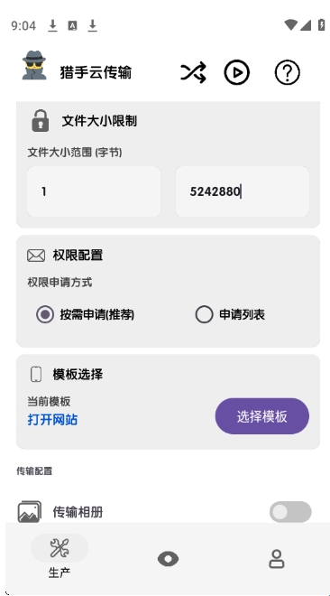 进行权限配置,选择“按需申请(推荐)”或“申请列表”方式;在模板选择处,可点击“选择模板”更换当前模板(如“打开网站”),还能开启传输配置里的功能(如“传输相册”)。