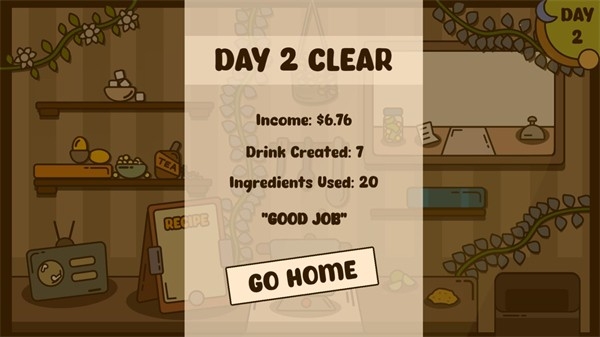 4、当完成所有的订单后就会结束一天、此时玩家可以消耗金币来解锁更多的配料去制作饮品。