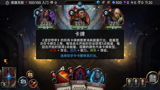 3、所有卡牌都需要消耗能量打出,能量显示在卡牌左上角。每场战斗开始时你会获得3点能量,每回合开始时获得2点能量。圆圈的颜色代表卡牌类型。红色=攻击,蓝色=能力,绿色=增益。