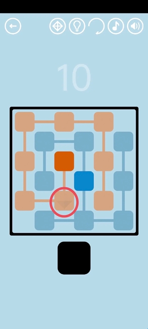 10、第10关点击方块之间的间隙会出现连接线,点击连接线可使其改变方向。连接线可以将方块连接,与彩色方块连接的方块会变成彩色,使所有方块变成彩色即可通关。一种通关方式如图所示。红宝石藏在随机一个黑色方块中,该方块变成彩色时会显示出红宝石的轮廓图中红圈的地方,之后点击此方块可以拿到红宝石。