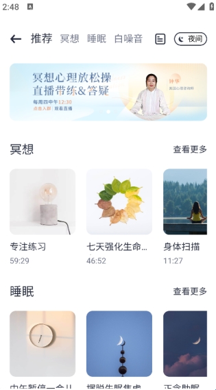 进入推荐页,可选择冥想、睡眠等分类,挑选 “专注练习”等进行体验。