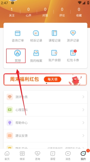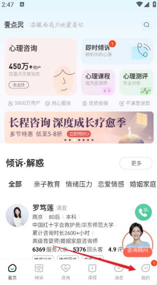 打开软件,进入首页,可进行心理咨询,也能即时倾诉、学习心理课程。