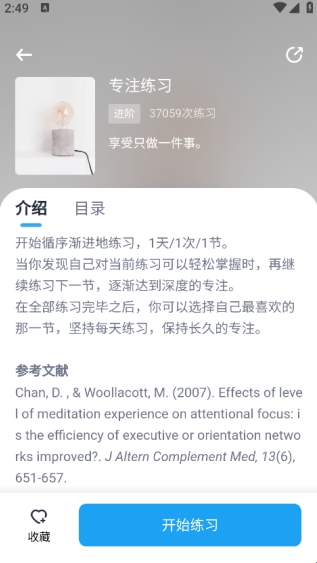 选 “专注练习”,查看介绍后,点击 “开始练习”,按引导逐步专注练习。