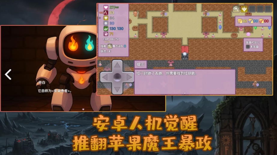安卓勇者与苹果魔王是一款以异世界地牢冒险为主题的扮演游戏。在这里,玩家将扮演成安卓勇士,通过前往地牢里不断地冒险探索,不断地击杀魔物,来提升自己的实力,然后装备上强大的武器撞,最终击败邪恶的苹果魔王。游戏的角色成长和技能学习都非常规律,欢迎感兴趣的小伙伴下载。