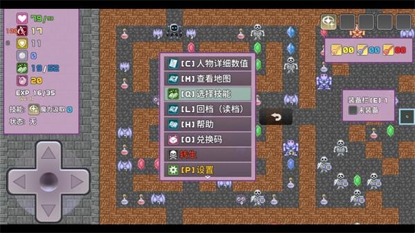 4、点击左上角可以打开菜单,你可以查看自己的数值、技能和地图。