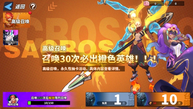 1、通过普通召唤和高级召唤可以获得英雄。召唤券的获取途径也有很多,首先是免费百抽,只要完成活动中的对应任务就可以获得高级召唤10连抽。