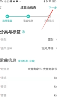 4、将该作品的各种相关信息全部填入,确认无误后,点击右上方“下一步”;