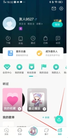 1、进入5sing原创音乐app后,首先点击右下角“我的”,在点击右下方“↑”按钮;