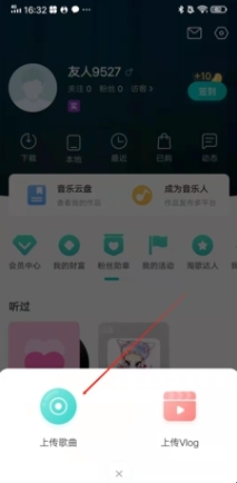 2、在弹出窗口中,点击“上传歌曲”,如果是视频,也可以点击“上传Vlog”;