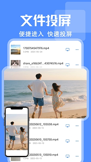 1、视频投屏:自动扫描本地视频文件,多种格式文件支持。智能解码播放,一键投屏。