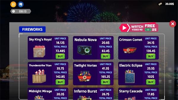 烟花商店模拟器英文名又叫做Fireworks Shop Simulator Games,是一款以美丽的烟花为主题的经营游戏。在这里,玩家将开设一家烟花商店,通过向顾客出售各种各样的烟花,来获得大量的收益,用这些收益可以去研究解锁更多烟花。游戏经营玩法独特,还融合了房屋装修玩法,朋友们快来下载体验吧。