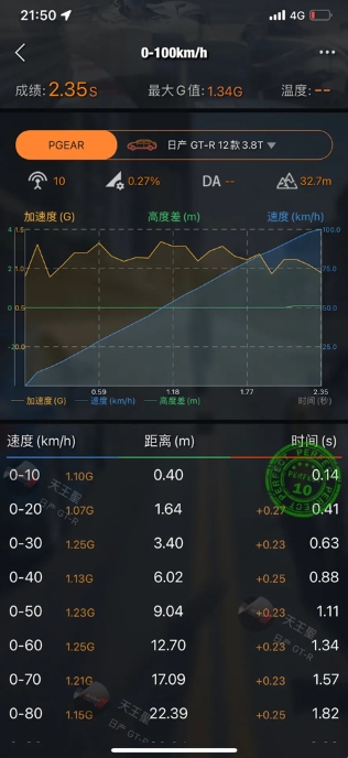 3、直线加速测试 、作为汽车性能的传统测试项目,车涯APP结合pgear可以精准测试0-100公里/小时、100-200公里/小时、0-200米、0-400米、60-160公里/小时、80公里/小时—5秒、100公里/小时-0等项目。