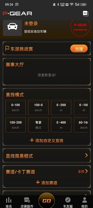 2、赛道测试 、在赛道模式中,用户可以在预先设定的专业赛道、赛车公园、室外卡丁赛道上使用PGEAR准确测试圈速。