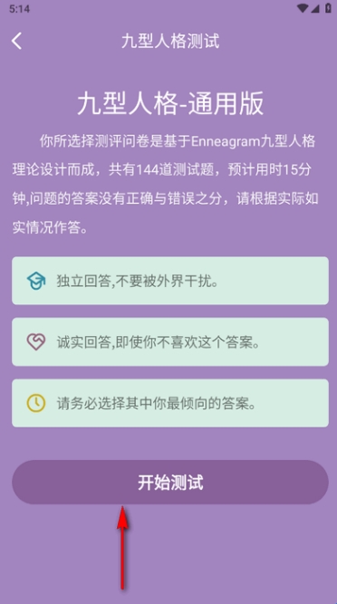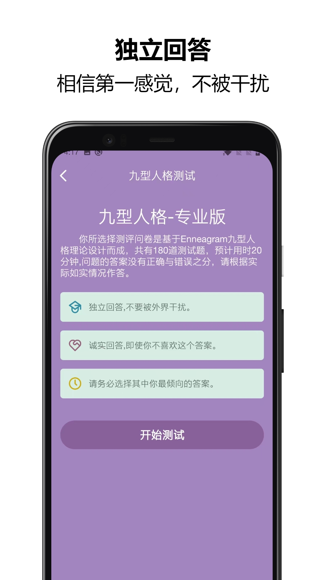 九型人格测试是一款专业测试性格的工具app。该软件会向用户提出一些问题,用户只需要按照心中说想认真回答,即可知道自己有什么样的性格特征和思维模式,或是了解到自己的情绪习惯,以便更正确的规划未来。在这里还分成了三个测试版本,如儿童版、专业版和通用版,分别对应则三种不同需求的人,有需要的朋友,欢迎下载体验。