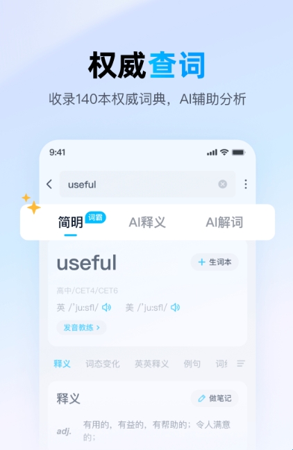 覆盖高中、四六级、考研、雅思、托福多身份,支持个性化定制,一键同步学习计划,听说读写专项练习,智能背单词,提高记忆效率。
