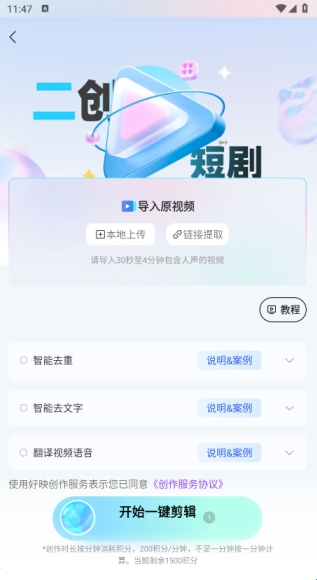 点击短剧二创,然后导入原视频,智能去重、智能去文字、翻译视频语音,再点开始一键剪辑。