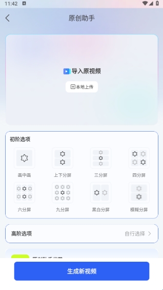 点击原创助手按钮,然后导入原视频,选择初阶选项、高阶选项,了解原创助手优势,再生成新视频;